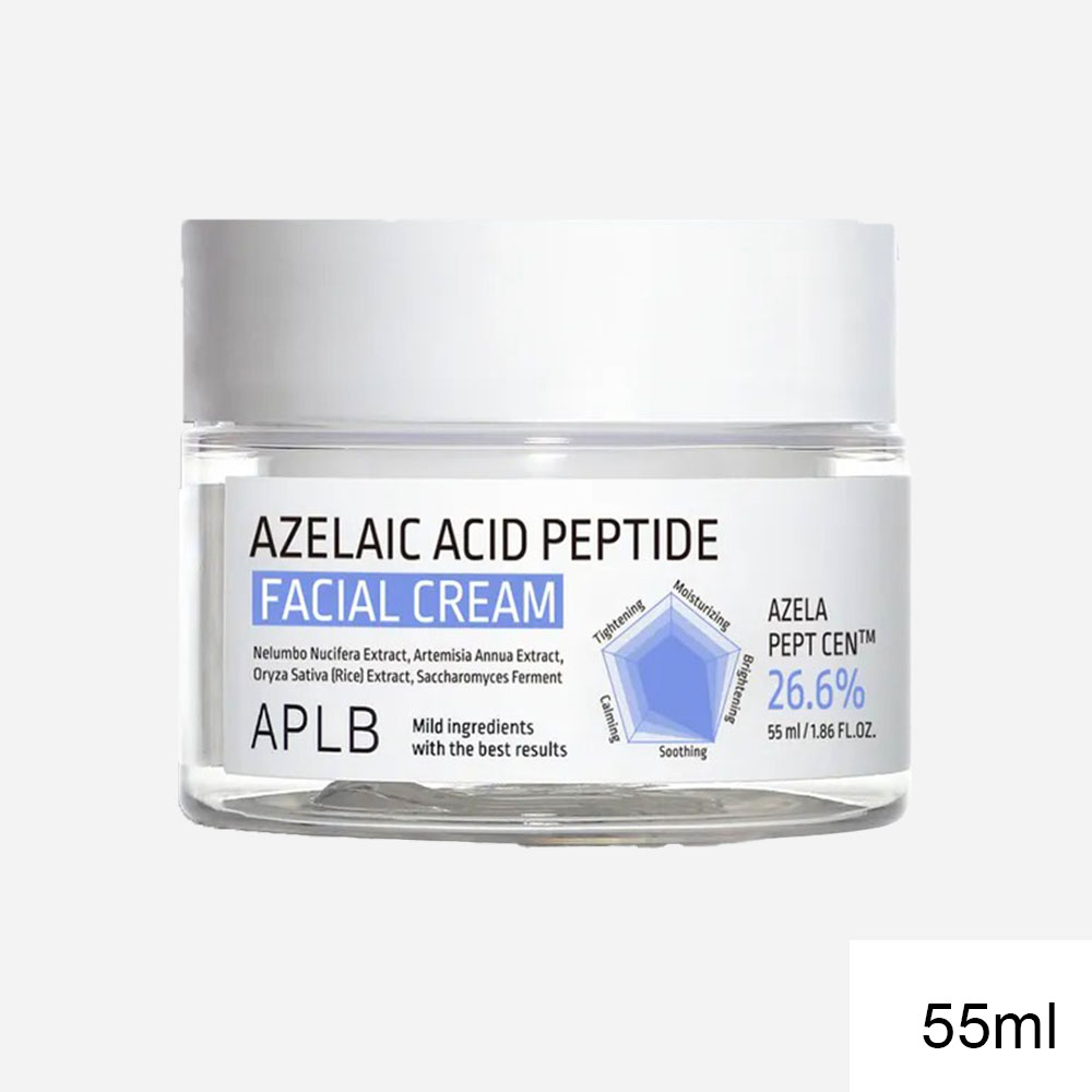 APLB Azelaic Acid Peptide Facial Cream (55ml) is a multi-care moisturizer designed to hydrate, brighten, and firm the skin. Enriched with azelaic acid to reduce blemishes, niacinamide for radiance, and peptides to improve elasticity, this cream helps restore smooth, youthful, and even-toned skin. Its rich yet lightweight texture absorbs comfortably without greasiness, making it perfect for daily use.
