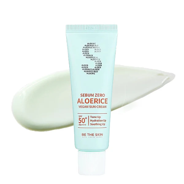 Be The Skin Sebum Zero Aloerice Vegan Sun Cream provides broad-spectrum UV protection with a calming, oil-controlling formula. The lightweight texture glides on smoothly with a matte finish that doesn't clog pores or leave a white cast, making it ideal for oily and sensitive skin types.