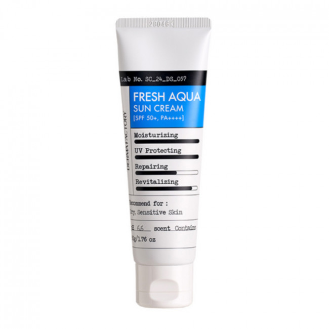 Derma Factory Fresh Aqua Sun Cream is a chemical sunscreen that provides SPF50+ PA++++ protection. Its lightweight, non-sticky formula absorbs quickly, leaving a refreshing finish without a white cast. Infused with a specialized moisture complex, it combines glyceryl glucoside, trehalose, birch sap, and ultra-low molecular hyaluronic acid to replenish moisture levels, ensuring skin stays hydrated and soothed throughout the day.