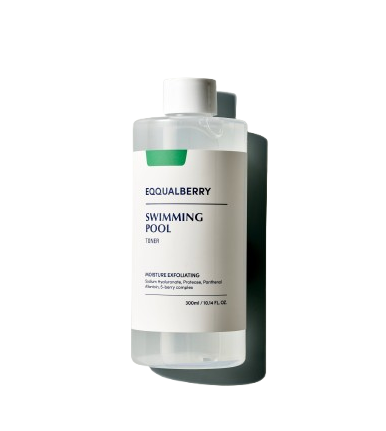 Eqqualberry Swimming Pool Daily Facial Toner 300 ml is a gentle, low-pH facial toner from South Korea. It softly exfoliates using a natural enzyme (protease) and deeply hydrates with eight types of hyaluronic acid. The formula also has a 5-berry complex to nourish and protect skin, and is free from alcohol, parabens, benzene, and strong irritants. So it's suitable for all skin types, even sensitive.
