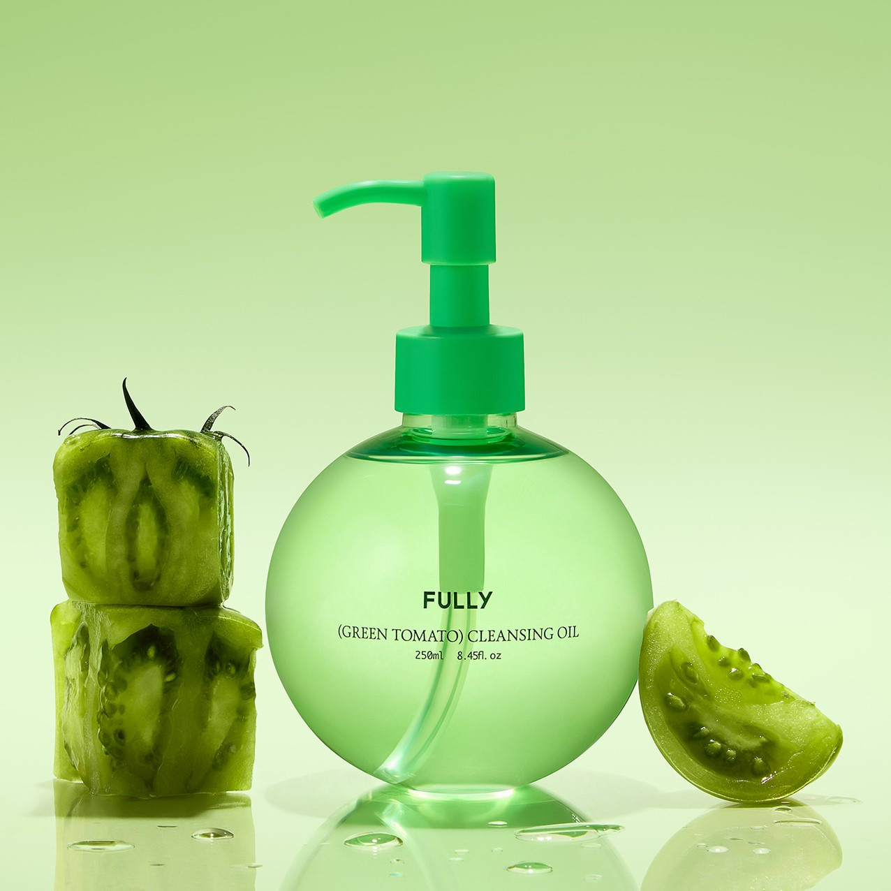 FULLY Green Tomato Cleansing Oil is a gentle yet powerful first-step cleanser designed to remove makeup, sunscreen, fine dust, and excess sebum without stripping the skin. The lightweight oil formula emulsifies with water and transforms into a soft milky texture that washes away impurities easily.
