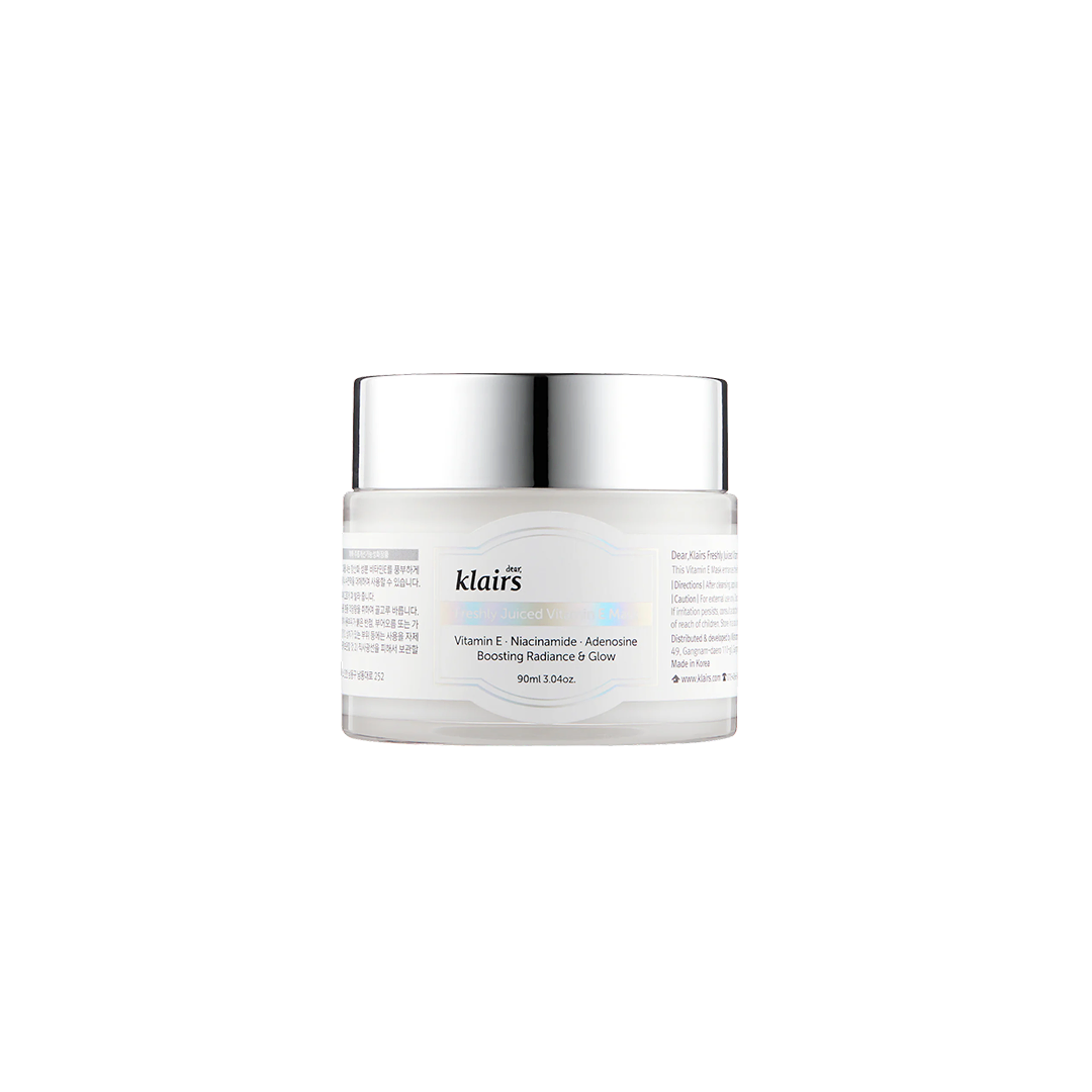 Klairs Freshly Juiced Vitamin E Mask is a rich, hydrating cream / sleeping mask that combines vitamin E, niacinamide, and adenosine. It has a pudding-like (“memory foam”) texture that clings to the skin, providing moisture and helping brighten skin tone while supporting smoother texture.