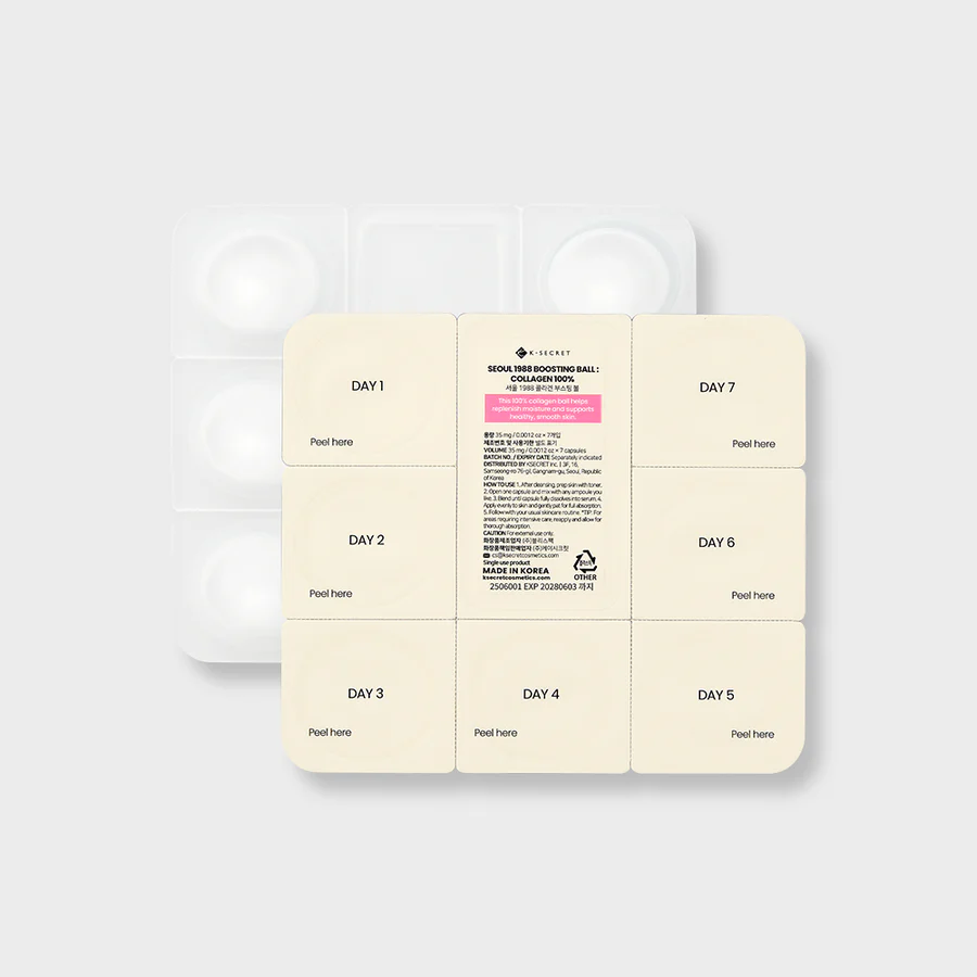 KSECRET SEOUL 1988 Boosting Ball Collagen 100% is a potent anti-aging booster that firms, hydrates, and revitalizes the skin for a youthful glow.