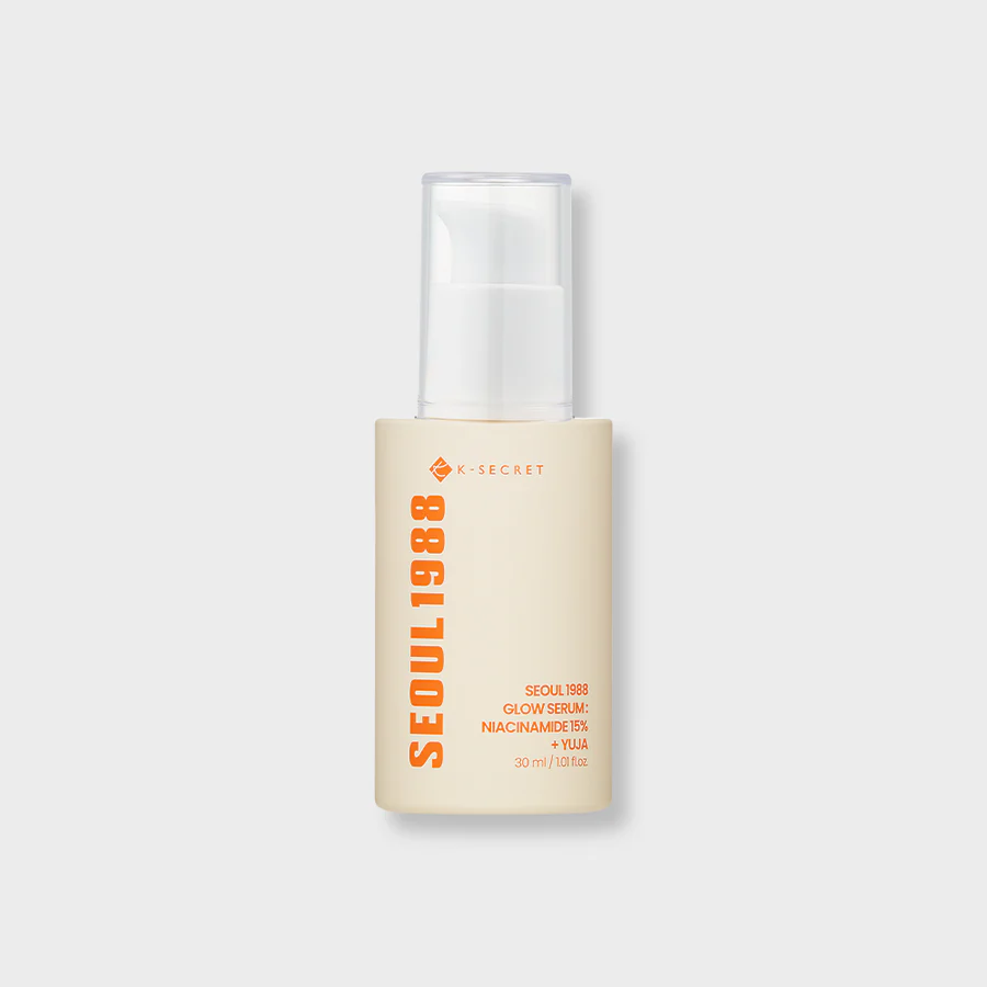 KSECRET SEOUL 1988 Glow Serum is a brightening, skin-clarifying treatment powered by 15% Niacinamide and Yuja (Citron) Extract. This lightweight serum helps fade dark spots, even skin tone, refine pores, and boost overall radiance.